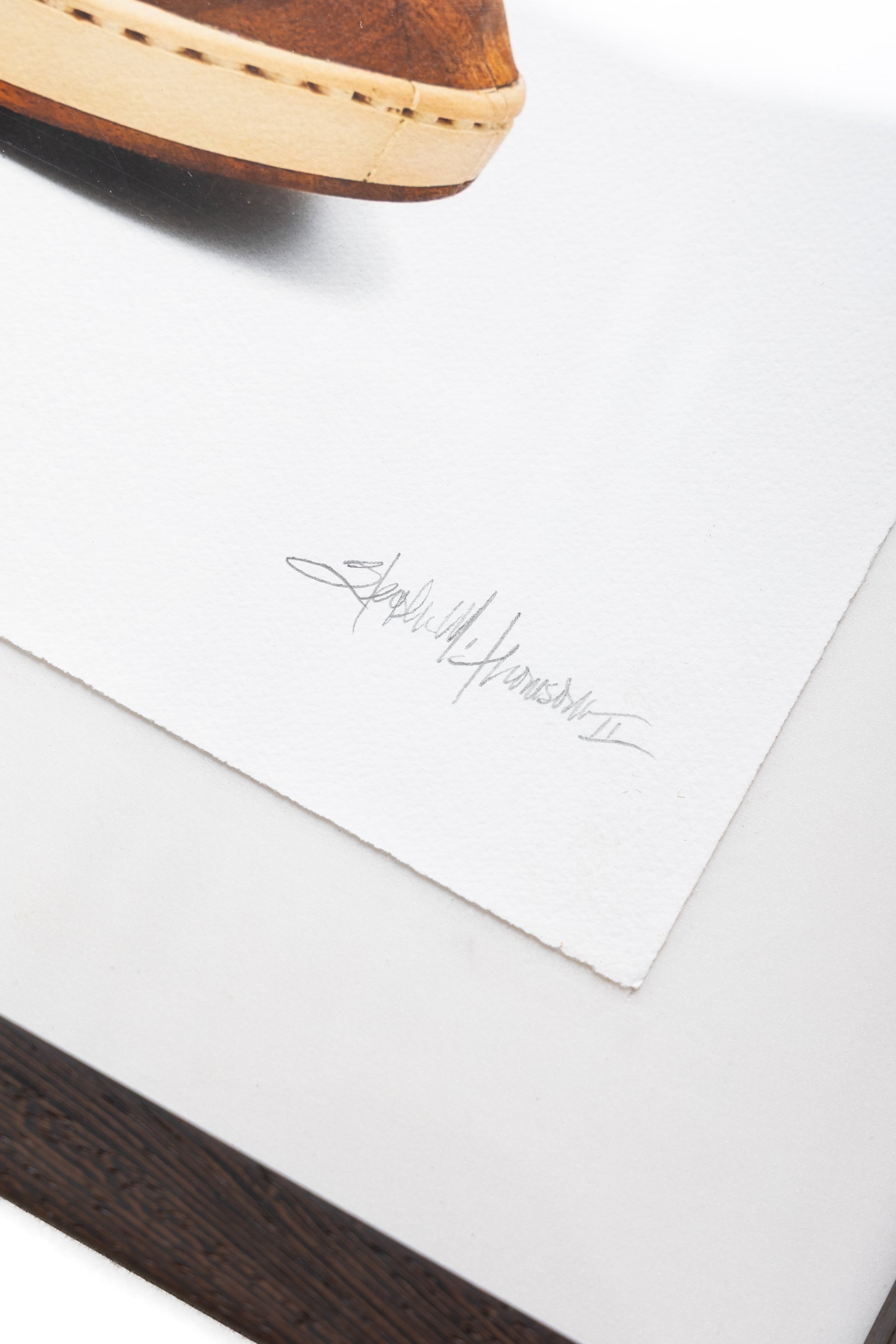 This 16x20 inch fine art print is a detailed reproduction of the artist's newest wooden inlay sculpture, 'Sneaker Sculpture No. 2'. The print was created using archival pigment ink on heavy cold press cotton rag 300gsm with hand torn edges.